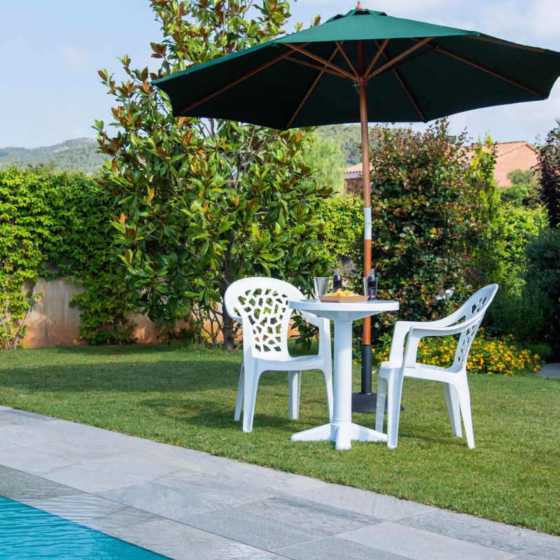 La table Esculapi ronde, d’un diamètre de Ø 70 cm et en coloris blanc, est idéale pour un usage extérieur. Réalisée en polypropylène injecté, elle offre une grande stabilité grâce à son pied central emboîté.
