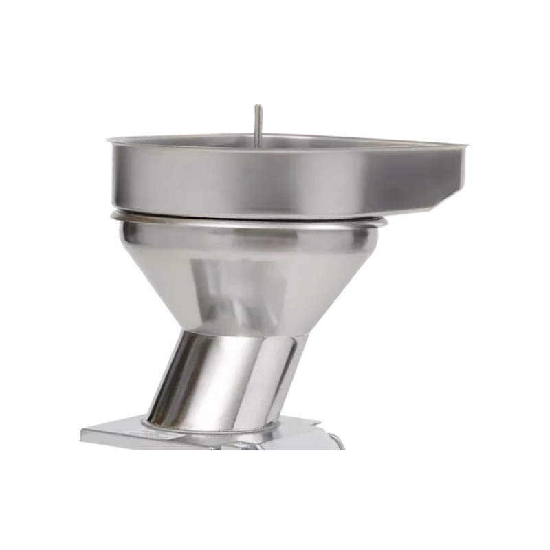 Robuust, uitgerust met een motorblok van roestvrij staal en biedt twee snelheden: 375 en 750 tpm. Het indrukwekkende debiet reikt tot 1.200 kg/uHet apparaat bevat een automatische roestvrijstalen goota 4,9 L volle maan glijbaan, cilindrische goten van 58 mm en 39 mma Exactitube-duwer, en vier buizen (2 van 50 mm en 2 van 70 mm).